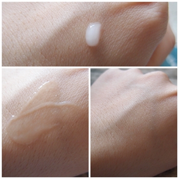 味道和保濕露一樣都是淡淡的花香調香味,擠出適量的亮眼菁萃在手背上,白色乳液質地,推開後的觸是很清爽的。