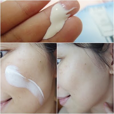 這是款純物理性的防曬,白色的水乳質地,帶點淡淡舒適的精油香味,均勻的塗抹在全臉,推開後就像有一層保濕一般,不會油膩、厚重,臉上易敏感處擦了也不會有刺激感,室外走了一圈後,臉上雖會冒汗快卻不會悶熱。
