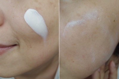 全臉使用十元硬幣大小的量,水乳狀的質地,選用了輕質化的油脂包覆水性美容液的概念,塗抹在全臉不會因為是高係數的防曬而顯得油膩,肌膚也不會顯白,就像是擦了美容保養液一般的保濕潤澤,即使在高溫的戶外走動也不會悶熱,也能重覆補擦不會有厚重感。