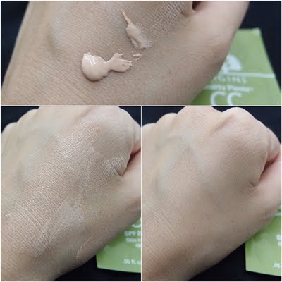 膚色的CC霜,帶有薄荷檸檬的清新香調,乳液質地的CC霜很容易推勻,塗抹完後臉上會有點亮粉感,在有光源的折射下臉部肌膚看起來更明亮,但在流汗過後臉上會變得油亮感。