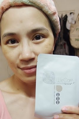 取出的面膜就吸附了滿滿的精華液,拿取面膜的手上也是沾了濕濕的精華。面膜紙是以一片白色膠膜撐住,在要敷臉時先將白色膠膜取下,再將面膜平敷在臉上,接著再調整面膜紙的角度。
