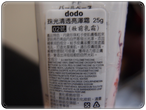 綜合 2012-01-01 01:26:00 日本最Hito的潮牌彩妝dodo珠光清透亮澤霜 內含珍珠粒子使肌膚看起來更明亮彷彿由內 自然散發出光澤,添加精華液的成分,給予皮膚滋養完美遮蓋毛孔,打造光潔美肌。適合皮膚暗黃,純植物提取 E可修復,獲得活力修正膚色,營造出洋娃娃般的自然光彩中文說明是貼在透明的膠膜上,製造日期:2011.06,02號的妝前乳霜,帶有些微的珠光亮澤效果,對於提亮肌膚、修飾不勻的膚色效果都不錯。看著dodo的logo設計覺得有印象,原來是好幾年前韓國平價保養品大舉進入台灣時曾購買過dodo的商品,只是那時買的是粉撲。看了官網的介紹,dodo彩妝是1989年在韓國成立的專業彩妝公司,也是韓國第一個彩妝品牌。 接著dodo挾著產品優勢進入日本市場,迅速擄獲有日本廣大消費者的喜愛與支持,也獲得日本彩妝界的大好評。 dodo珠光清透亮澤霜質地較像乳液狀,除了容易推勻、吸收,瓶身的設計也很卡哇伊,很日本風格,亮澤霜清爽,商品又很可愛,難怪能打進日本市場,就連我都愛不釋手。 塗抹均勻後會看見手背上只會有些微的珠光感,珠光淸透亮霜帶著淡淡的典雅香味。 我最愛它擦在臉上珠光感並不會太明顯,也因此撲上薄薄的蜜粉也不會有臉色太白、太亮的錯覺,質感很像是乳液,擦上並不會有厚重感,卻又能讓臉上肌膚有清透亮白的質感,對於懶惰的我來說,擦上dodo珠光清透亮澤霜能每天早上的上妝減少些時間,輕輕鬆鬆就能營造出好膚色的效果。http://www.dodo-tw.com/web/index愛美的女孩們快到dodo的粉絲頁按讚留言就能拿好禮!http://www.facebook.com/dodo.tw.makeup 創作者介紹 Nellie1595 Nellie1595的部落格