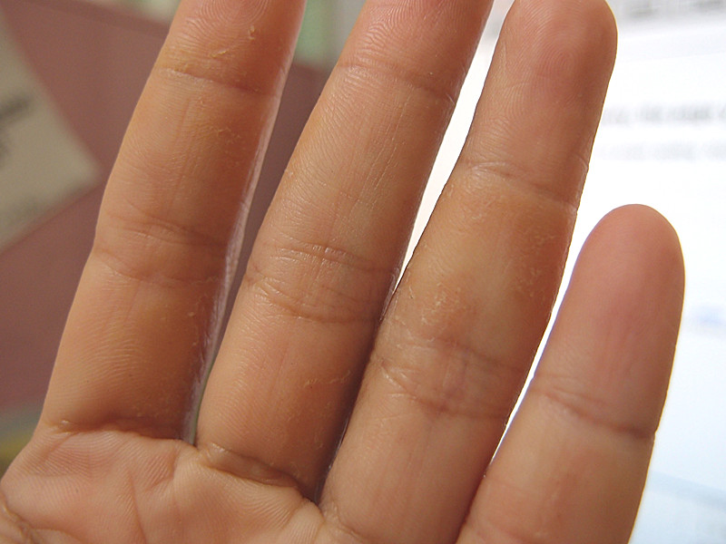 平時做家事懶的戴手套,而最近又換了別款的清潔劑,使用了幾次後才驚覺新的清潔劑很咬手,但已經來不及囉,手指的富貴病就開始啦!已經開始有脫屑的現象。