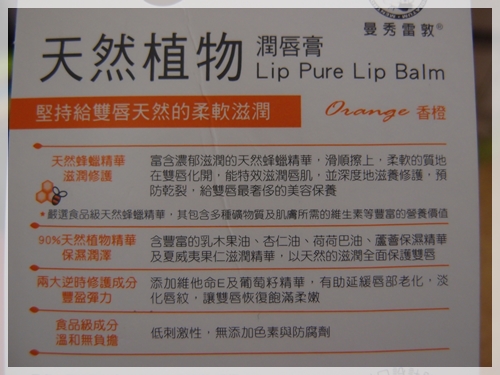 拿到曼秀雷敦護唇膏時,就有著濃濃的香橙味撲鼻而來;管狀式的口紅型護唇膏外形也很簡單的印著『Lip Pure』,簡簡單單的樣式,一整個就是我的最愛啊!