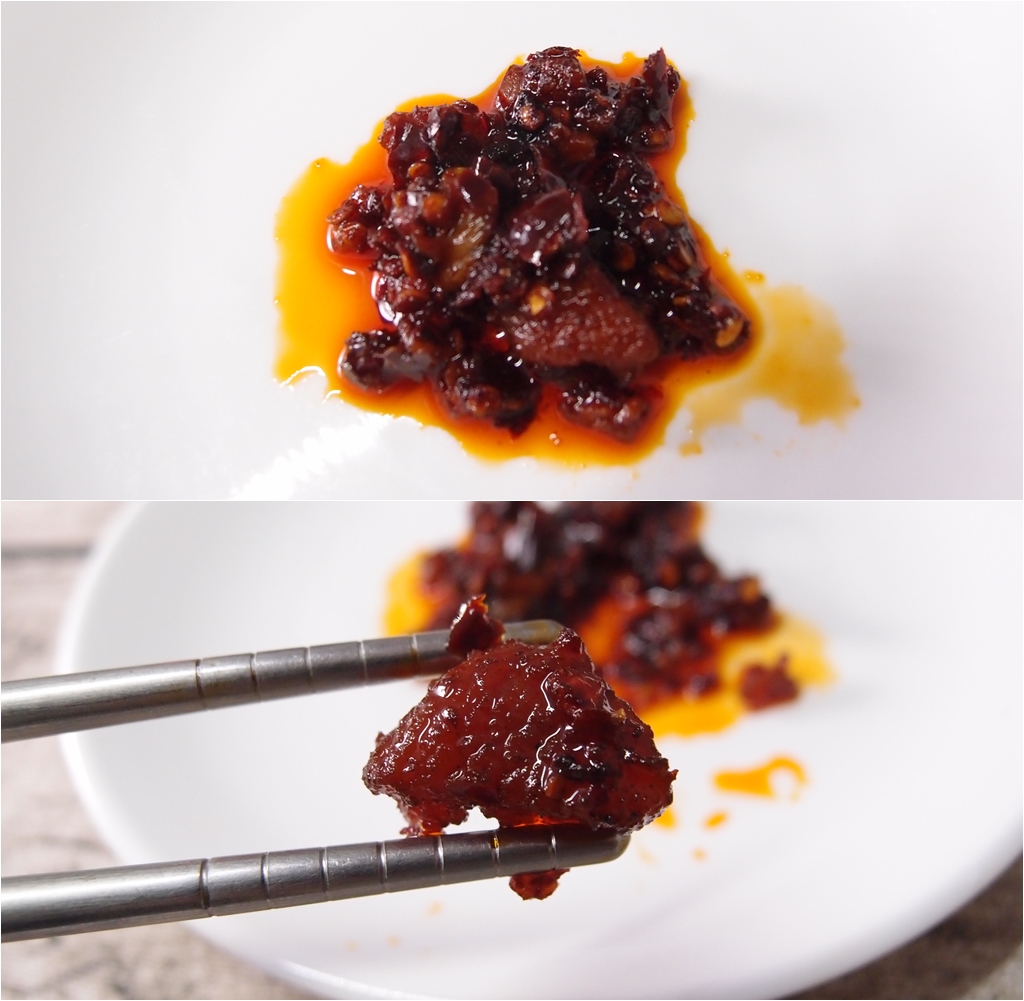第一次還很客氣的拌一點老干媽香辣脆油辣椒醬,有花椒風味獨特的香氣,香辣夠味,以我來說並不覺得辣口,但千萬要小心,會忍不住一直再追加辣醬!還會吃到炸的酥脆的豆鼓。