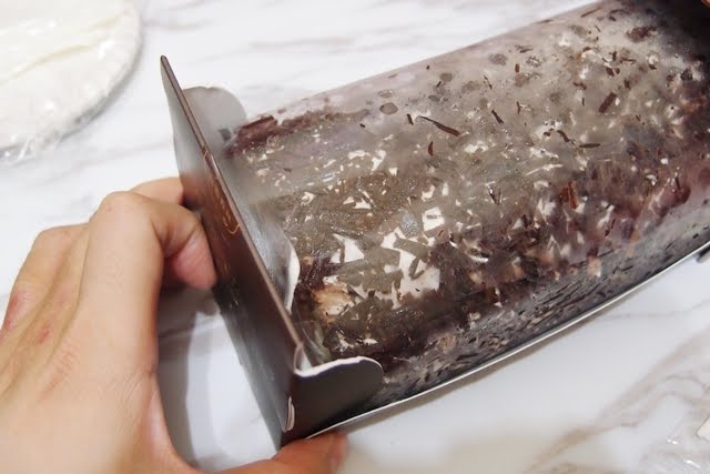 白雪森林蛋糕捲,原以為是外層灑白巧克力碎片的蛋糕捲,取出蛋糕捲時還有點疑惑,上禮坊官網看了,白雪的部份是內餡裡的優質鮮奶油做成的,蛋糕捲則是由一片塑膠膜固定住,這樣最上層的黑巧克力碎片才能穩穩的留在蛋糕捲的最外層,也能維持蛋糕捲盒內的潔淨俐落感。