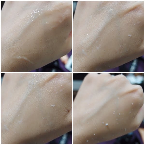 在手背上試用,以畫圓方式輕搓,先是化開像是擦一般保養品一樣,但越畫圓就越會搓出白屑屑。