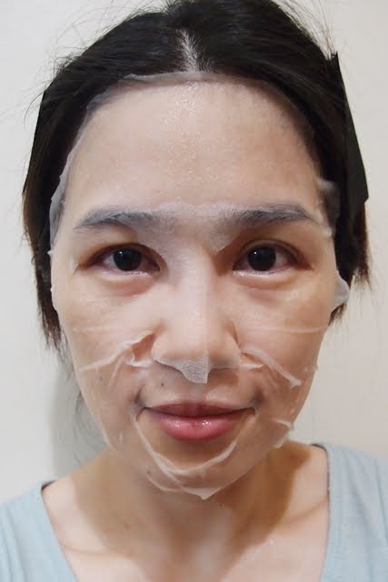 小心的將面膜紙取出,並取下白色膠膜平敷在全臉,面膜紙的剪裁能均勻
