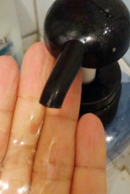 按壓大概1~2下的洗髮乳,透明的水乳狀,帶點淡淡的香味
