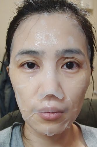 取出面膜後我是先由眼眶及額頭部份開始平舖上面膜,大概調整下後就取下珍珠膜紙
