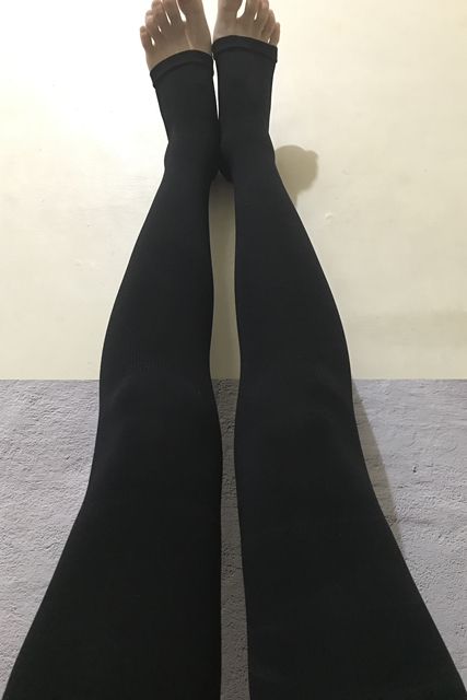第一次穿著前先將纖腿襪置入洗衣袋裡再投入洗衣機裡清洗。穿著時將纖腿襪捲起來再套任腳底開始穿著,感覺纖腿襪在腳板、腳踝處是最緊的,要費點力氣拉上,但過了之後的穿著方式就很輕鬆,往上拉至大腿部位即可。