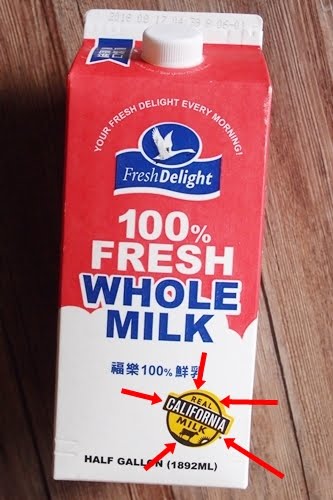 包裝上有Real California Milk標章是代表所用的乳源是天然純正100%來自加州