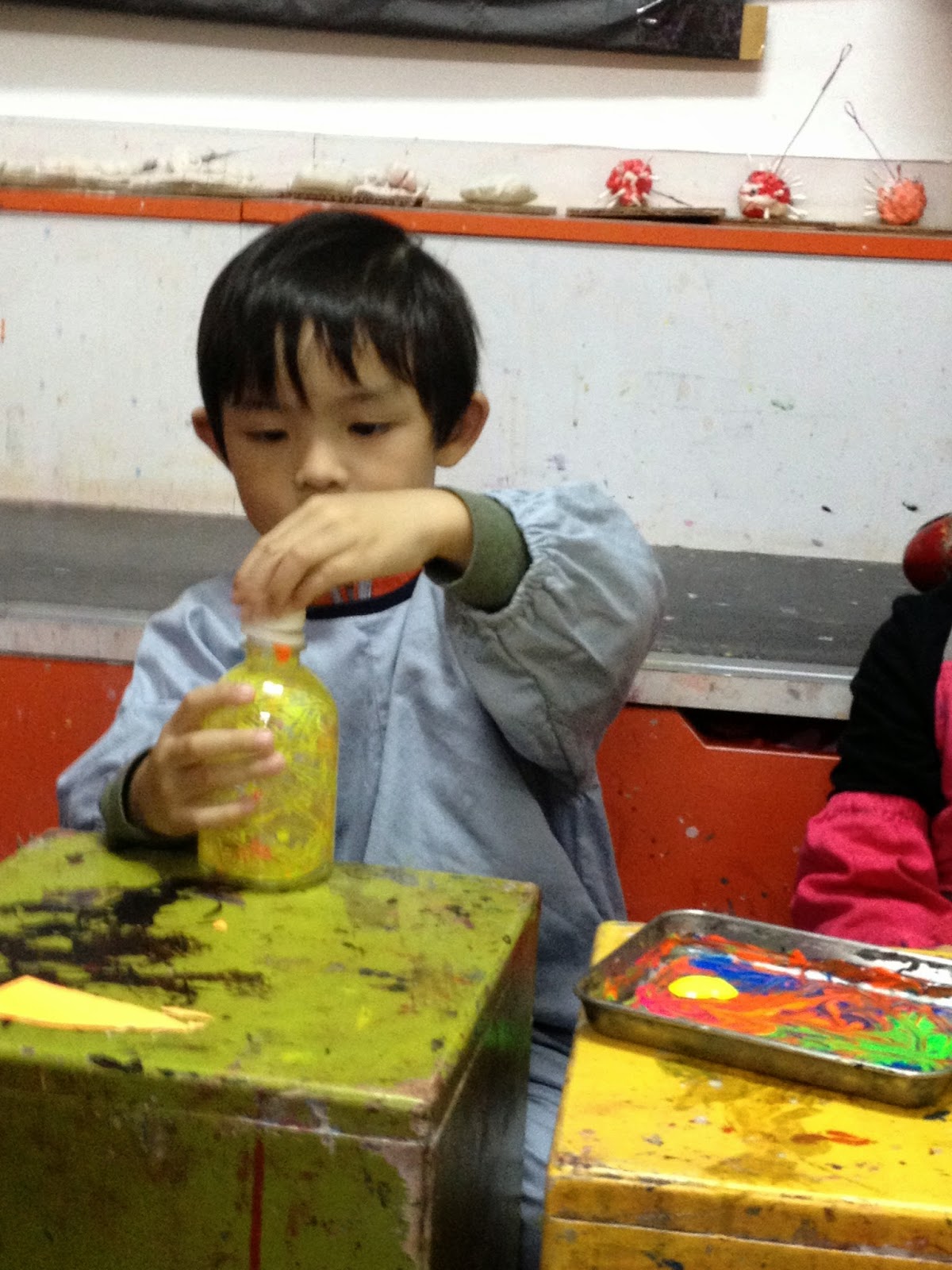 ☃接著每人拿一個小寶特瓶, 老師會擠螢光顏料在瓶子裡, 接下來小孩可以做他們最喜歡的事, 放彈珠進去瘋狂的Shaking