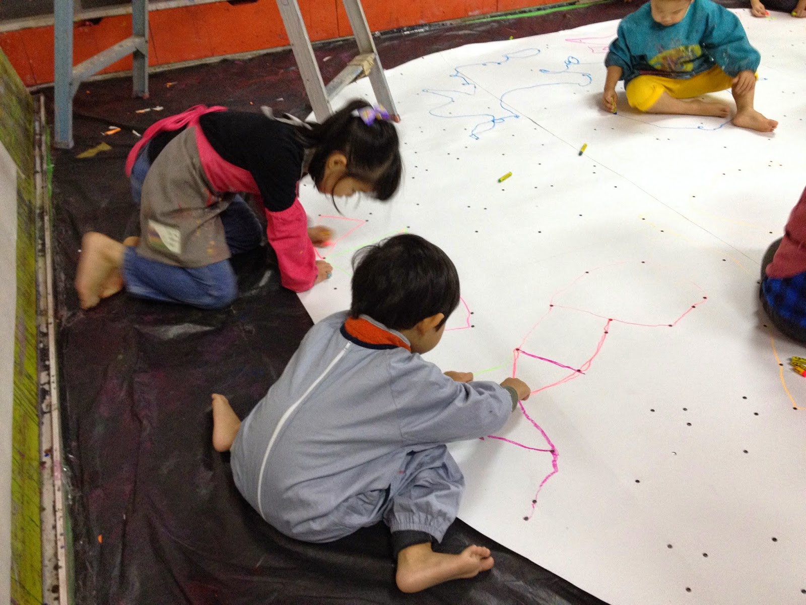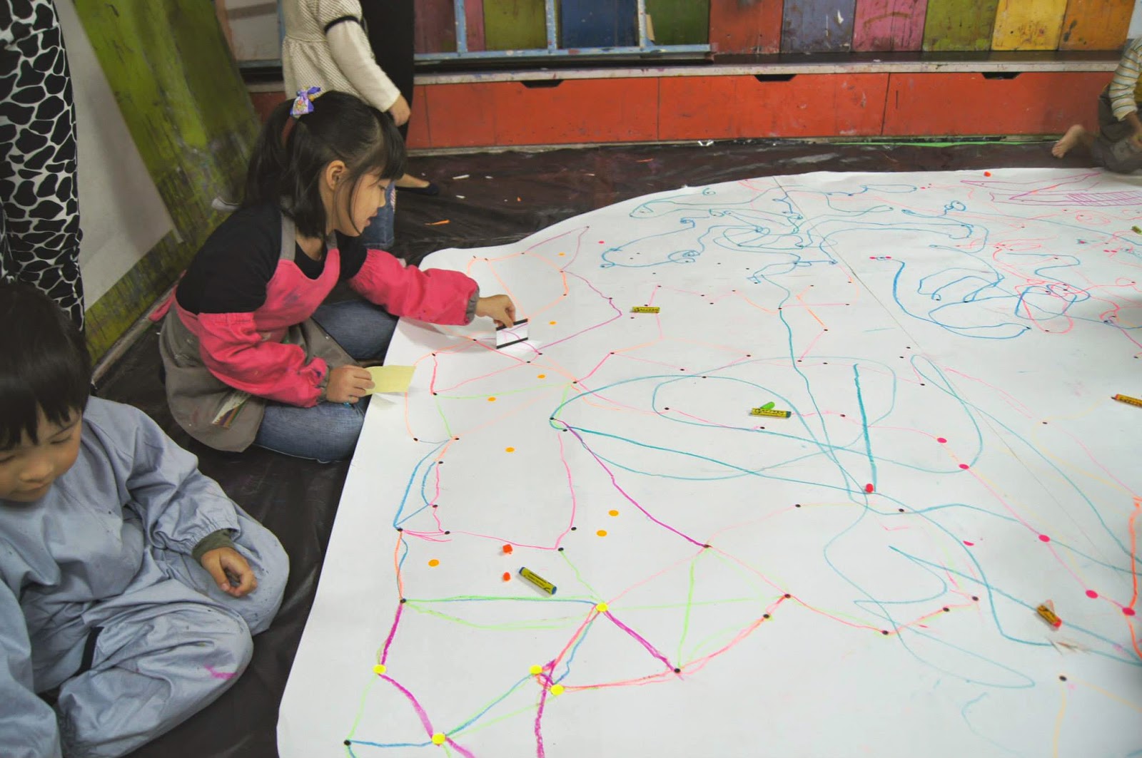 ☃老師發了螢光色的蠟筆給大家, 小孩可以運用想像力把洞跟洞連線