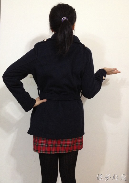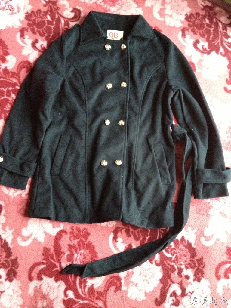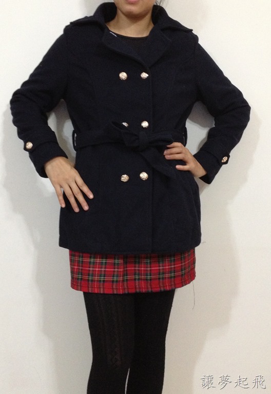 最後是這件~皇家質感雙排釦毛呢腰綁帶長版外套~深藍 39