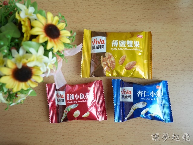 有萬歲牌蔥燒辣小魚花生96G、萬歲牌杏仁小魚80G、萬歲牌薄鹽雙果96G