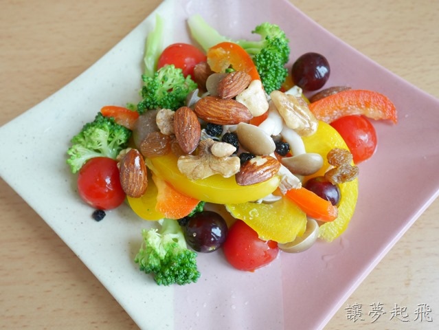將蔬菜、菇類稍微川燙後,擺上葡萄、番茄、堅果,最後加入連淨純苦茶油 並灑上些許海鹽