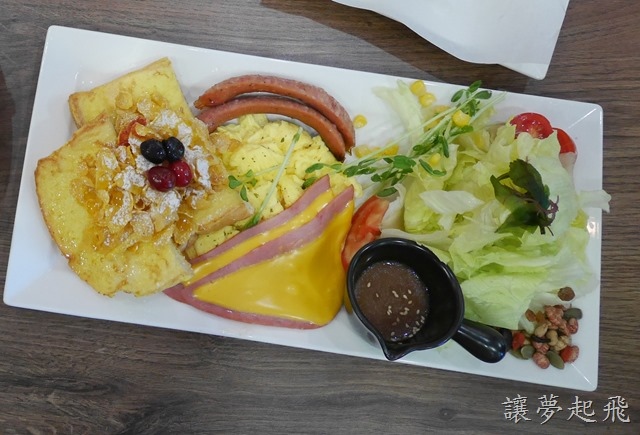 內容物有~法式吐司+香腸+火腿起司+嫩蛋+(沙拉or薯條),我選了沙拉