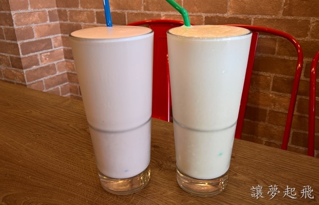 冷飲我們點了草莓牛奶(左)、豐滿木瓜牛奶(右)