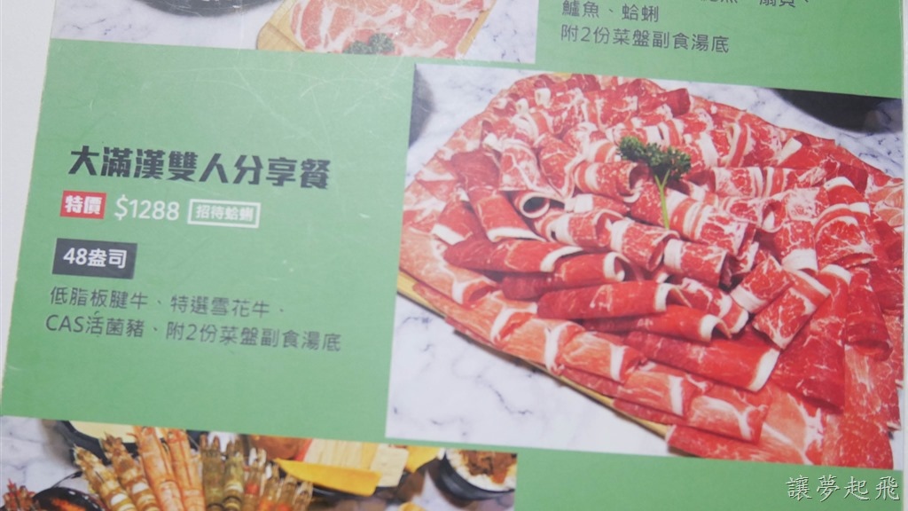 大滿漢雙人分享餐包含特選雪花牛、低脂板腱牛、CAS活菌豬