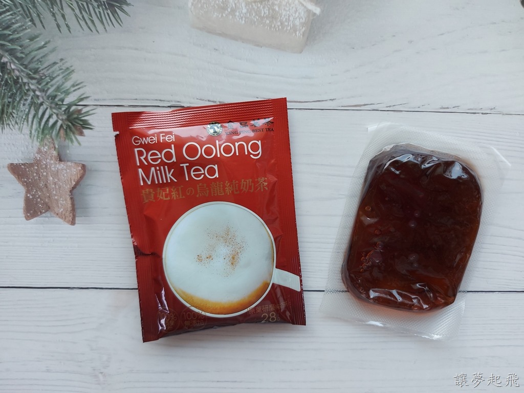 成分包含有貴妃紅烏龍超細緻研磨茶粉、紐西蘭全脂奶粉以及黑糖高纖蒟蒻珍珠