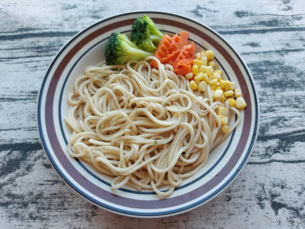 將麵條煮好拌上醬汁後,自己加上水煮蛋和花椰菜、番茄等配菜