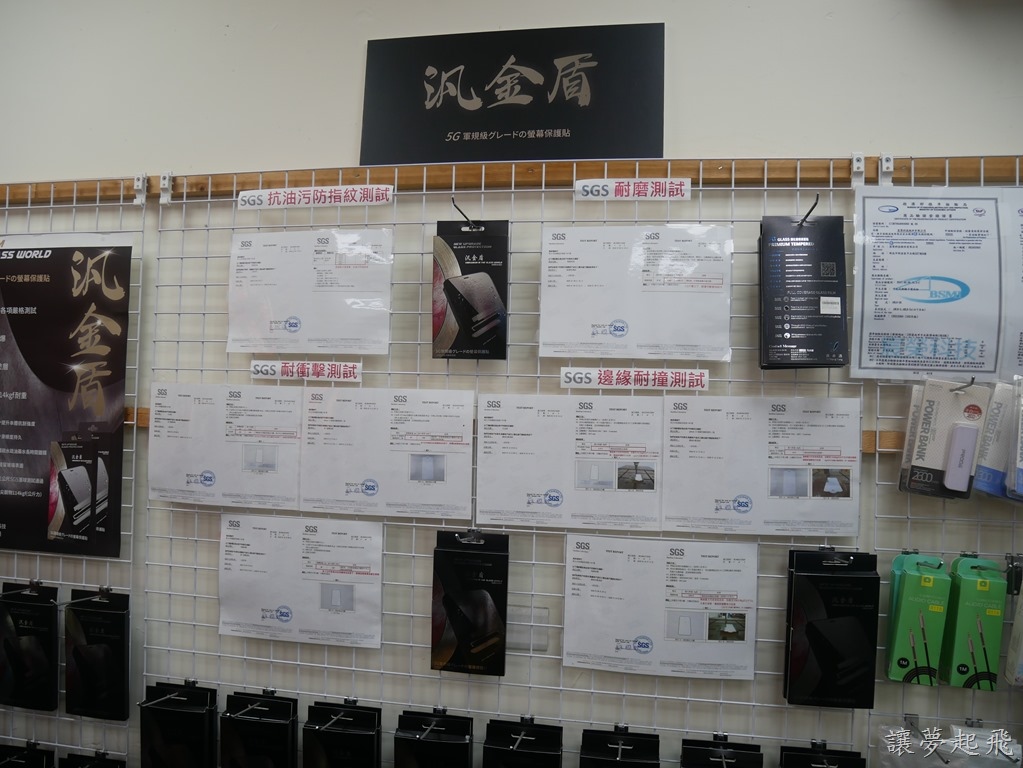 裡頭牆上有著滿滿的 「汎金盾保護貼」SGS的多項認證