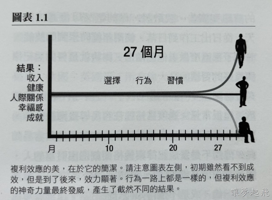 書中有兩張圖最令我最印象深刻,第一個是原本擁有條件差不多相似的三個朋友,一個人維持現狀,另外兩個人分別做的不同微小改變。一開始大家都沒有什麼不同,但是在經過27個月後,彼此之間產生了爆炸性的差異。