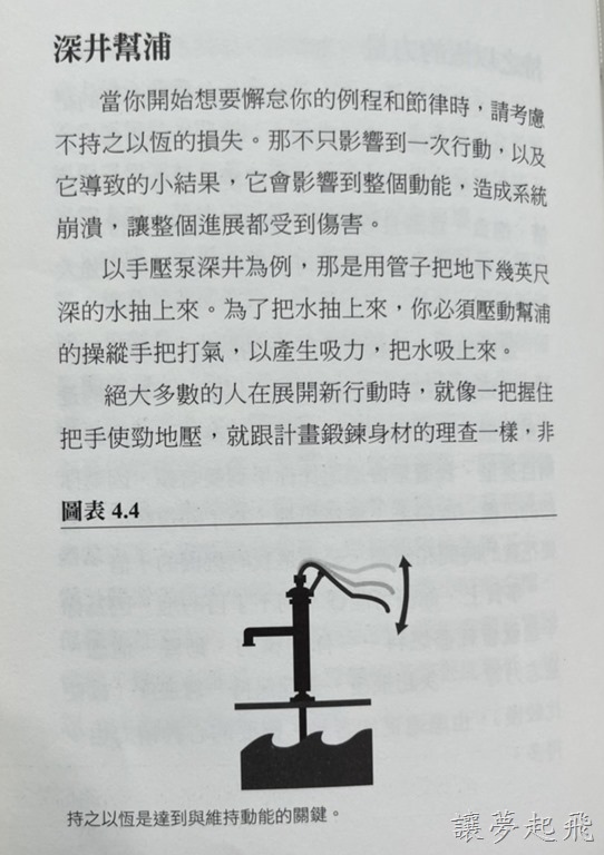 另一個則是深井幫浦的圖。行動的重點不在於一開始的強度及頻率,重要的是持續性。因為一旦你開始努力讓動能能夠自己運行後,「大魔」就會加入你的習慣,讓它成為自然而然,不需要努力就能自動運行,就如同牛頓第一定律一般。