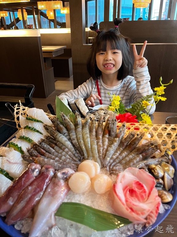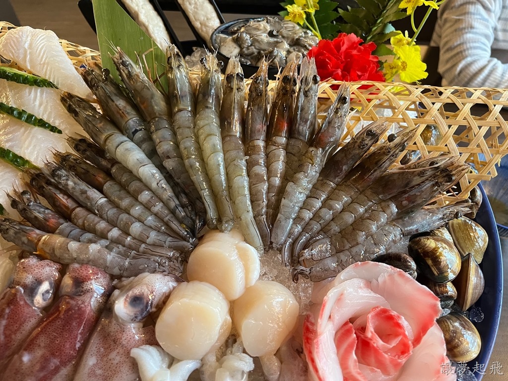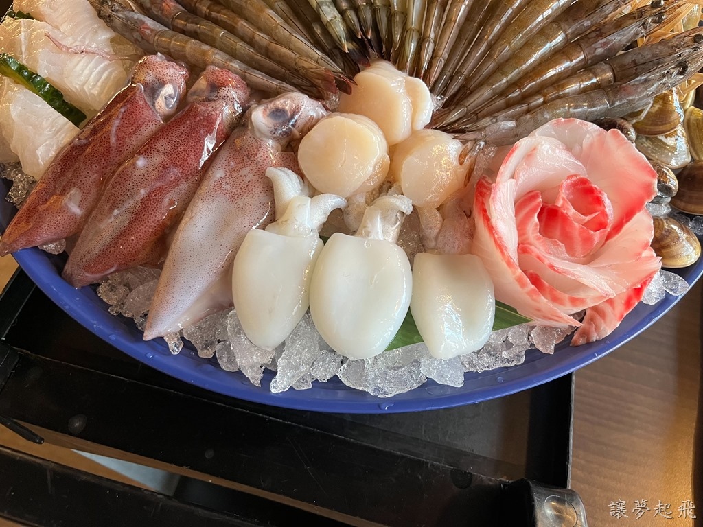 海鮮盤裡頭有小花枝、鯛魚片、干貝、小卷