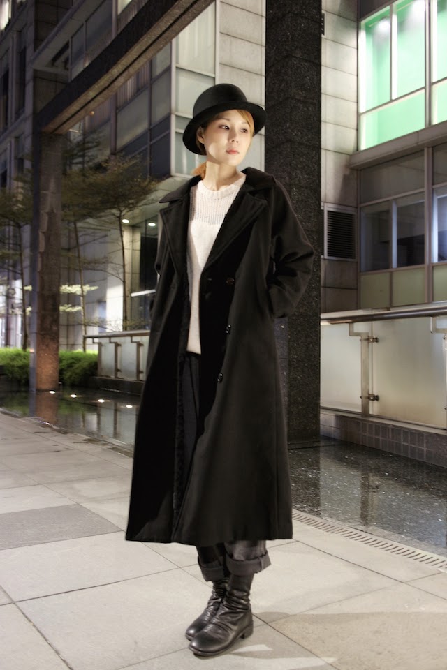 黑色羊毛禮帽X白色鏤空毛衣X灰色老爺褲X黑色長大衣X黑色短靴