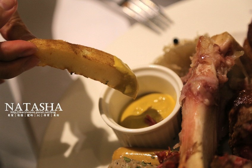 一旁還有德式香腸和薯條,以及德國豬腳絕對少不了的德式酸菜,