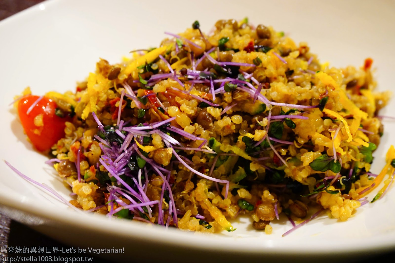 它是拌炒蔾麥、扁豆、核桃、風乾蕃茄、味噌,再加上些許生南瓜絲帶入微微的甜度,及清新的番茄、紫包心菜、豆芽、以及由花園剛採下的新鮮薄荷葉~~