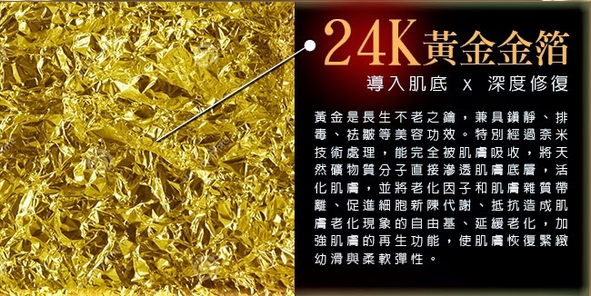 我們都知道黃金是長生不老之鑰,特別經過奈米技術處理,能完全被肌膚吸收!!