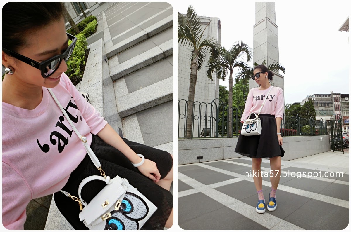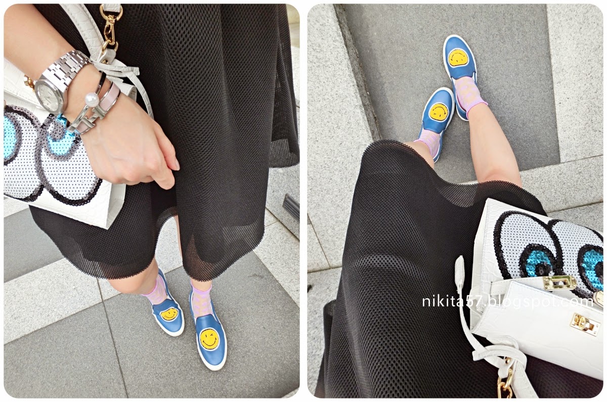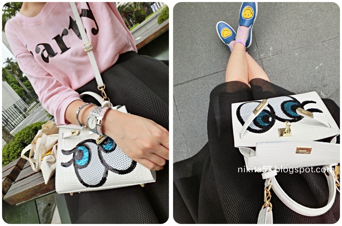 隨意的Sweatshirt搭配黑色澎裙 笑臉Slip on和Play no more的眨巴眼包包