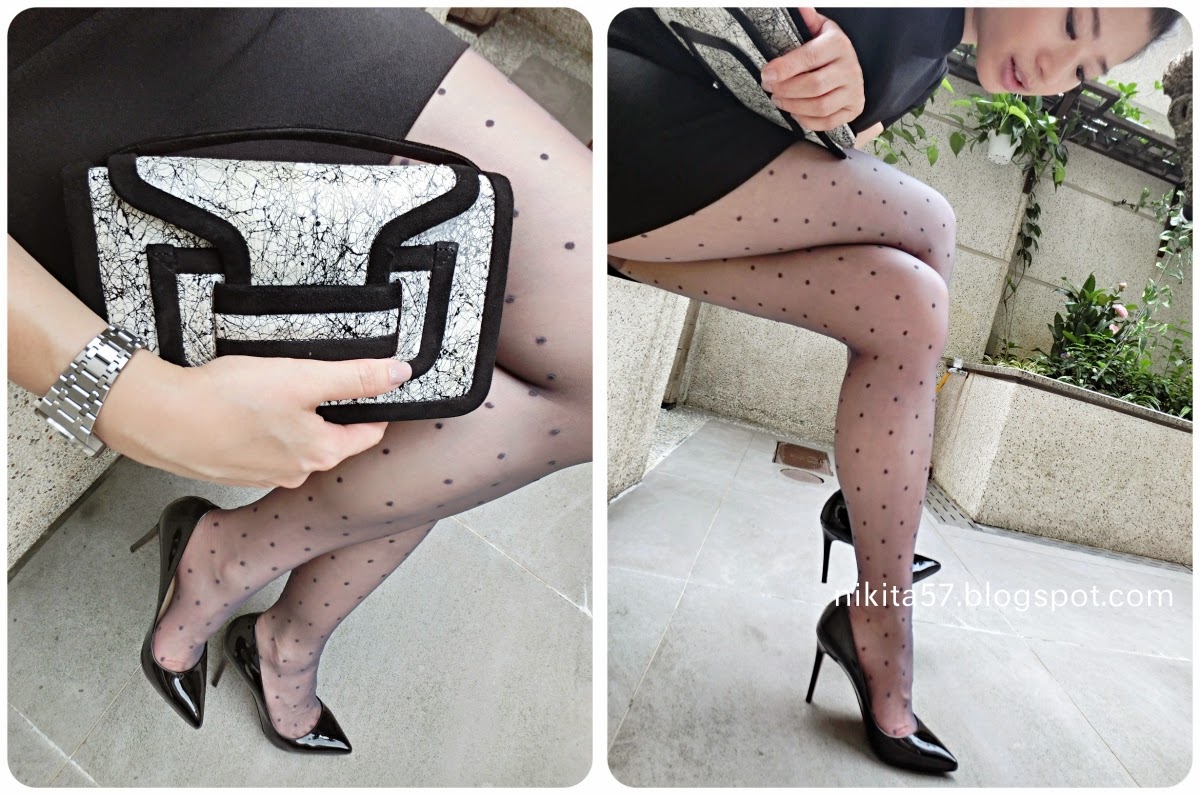 如果覺得黑色小洋裝直接穿太單調 可以試著搭配透膚的波點絲襪喔!