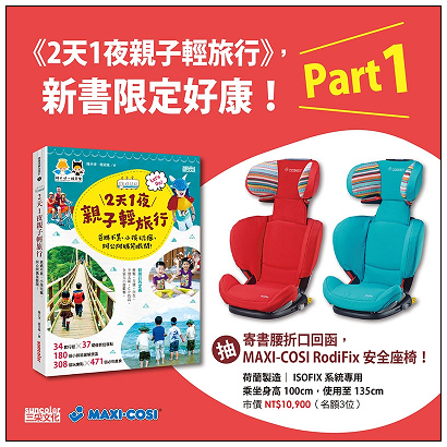 喜歡安安的紅色頭等艙 (Maxi-Cosi 兒童成長型汽座)嗎?,快把「2天1夜子輕旅行:爸媽不累、小孩玩瘋、阿公阿媽笑眼開!」的書腰剪下來寄回參加抽獎活動,就有機會得到同品牌Maxi-cosi另一款安全座椅喔~