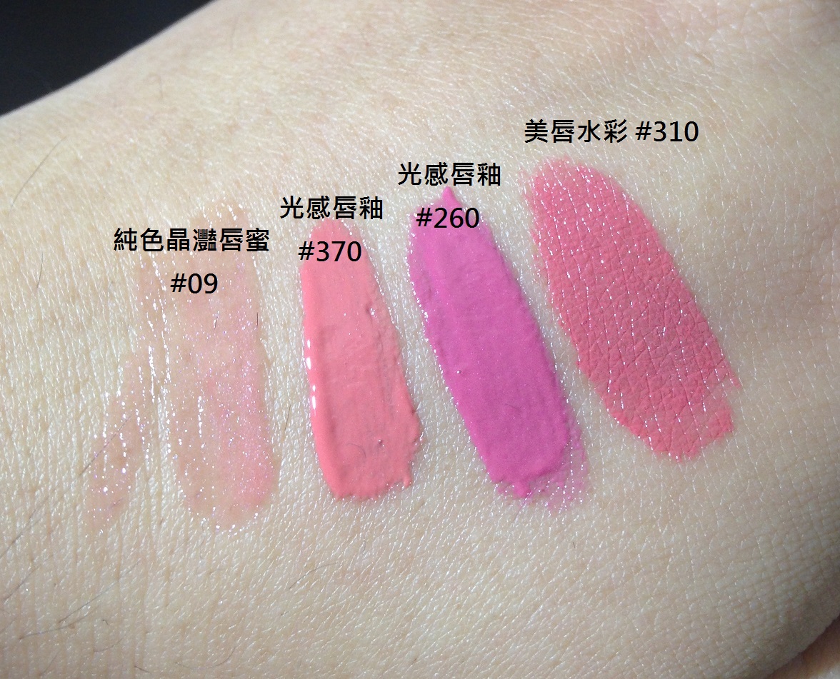 下面的圖是手邊有的舊版唇蜜、新版唇釉跟美唇水彩