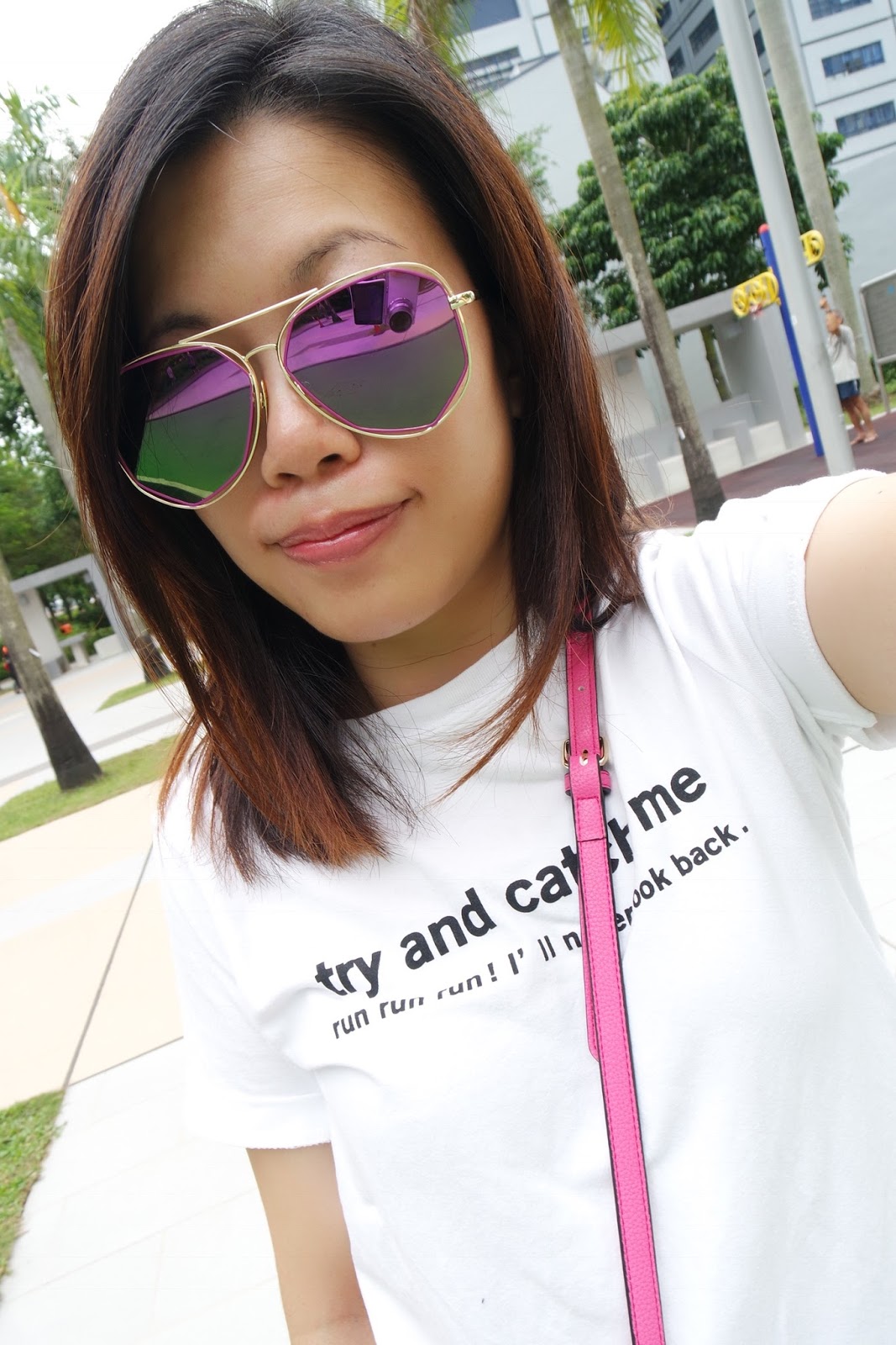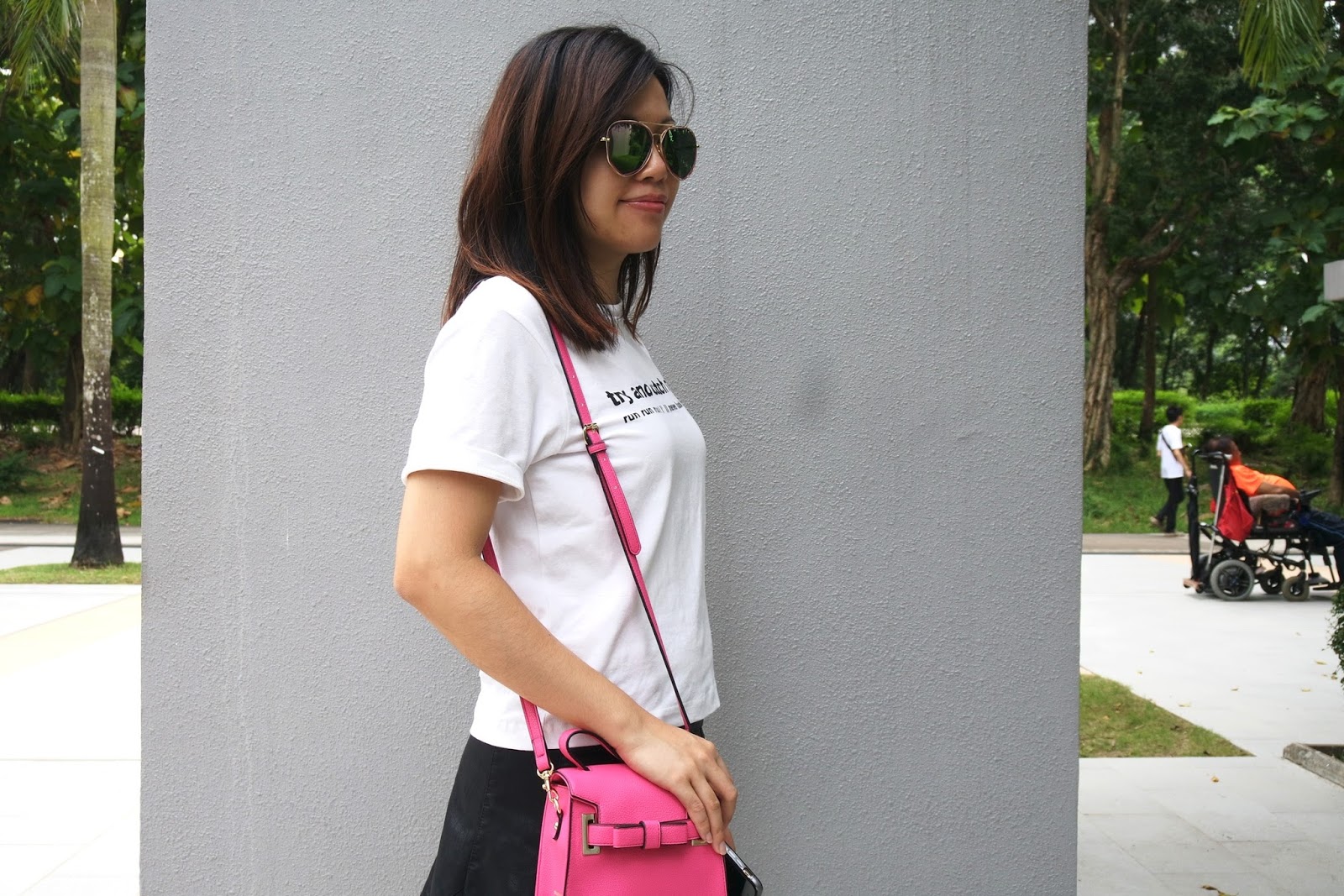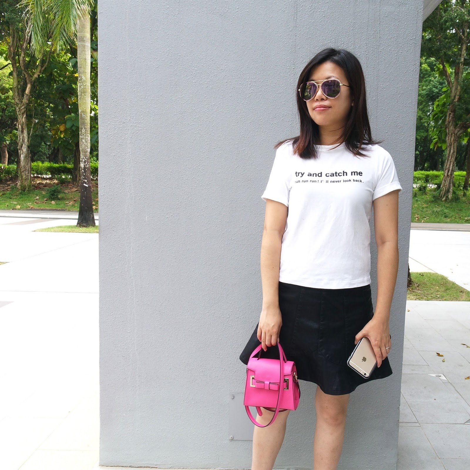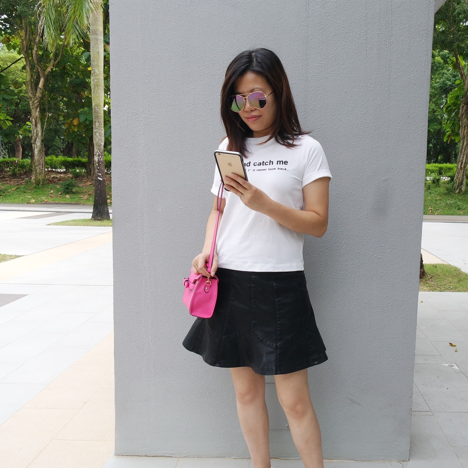 時尚穿搭 2016-10-05 03:30:00 20161005 OFOTD 雖然只是初秋。天氣還沒開始冷 可是我已經迫不及待..仿皮裙出來了。 OFOTD 大大的金色太陽眼鏡 ~購自上海 白色上衣 ~Collect Point 仿皮荷葉形半腰裙 ~CLINIRIS CLINIRIS Adidas ~ Stan Smith 白色波鞋 桃紅色Mini小包 ~ Samantha Thavasa
