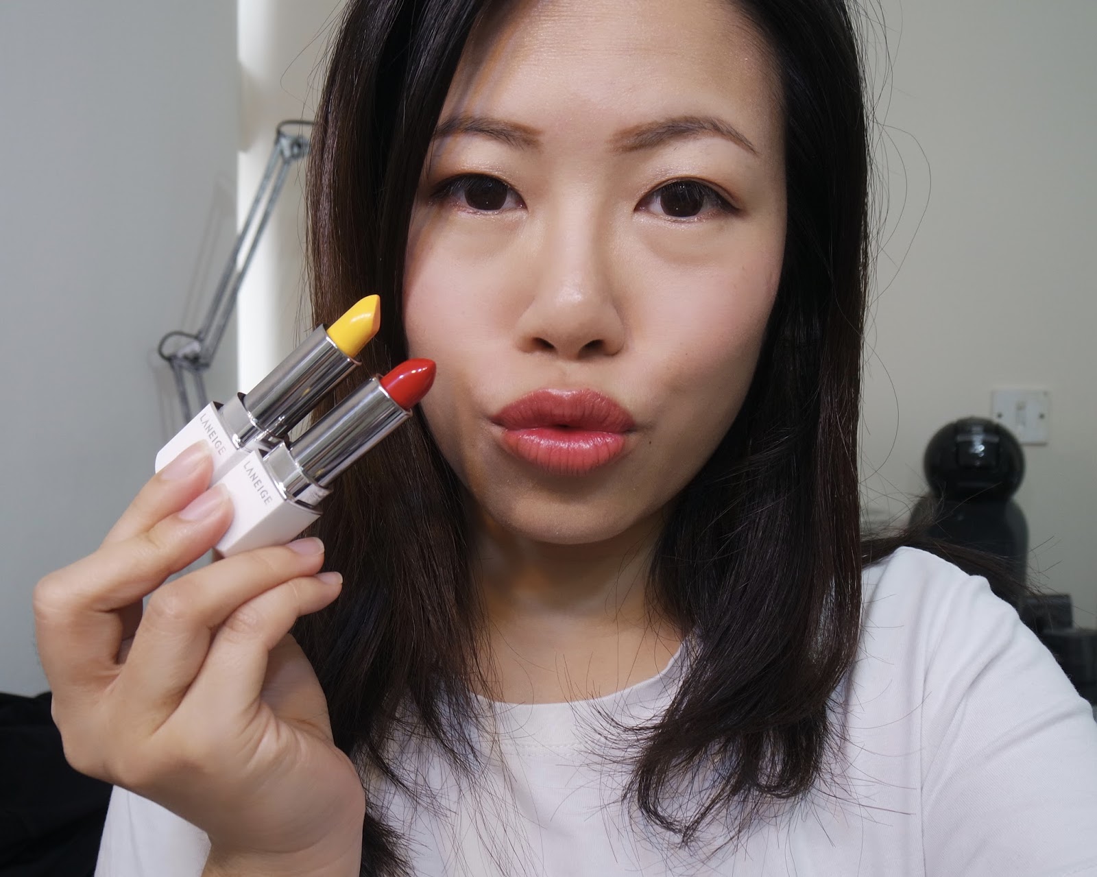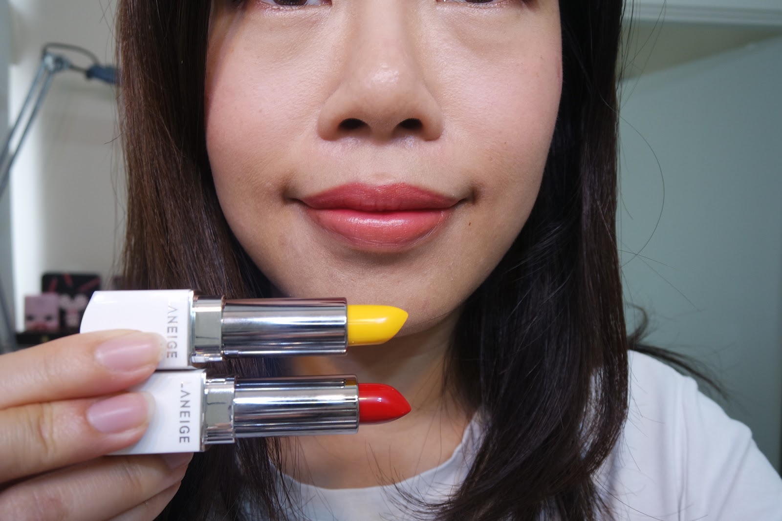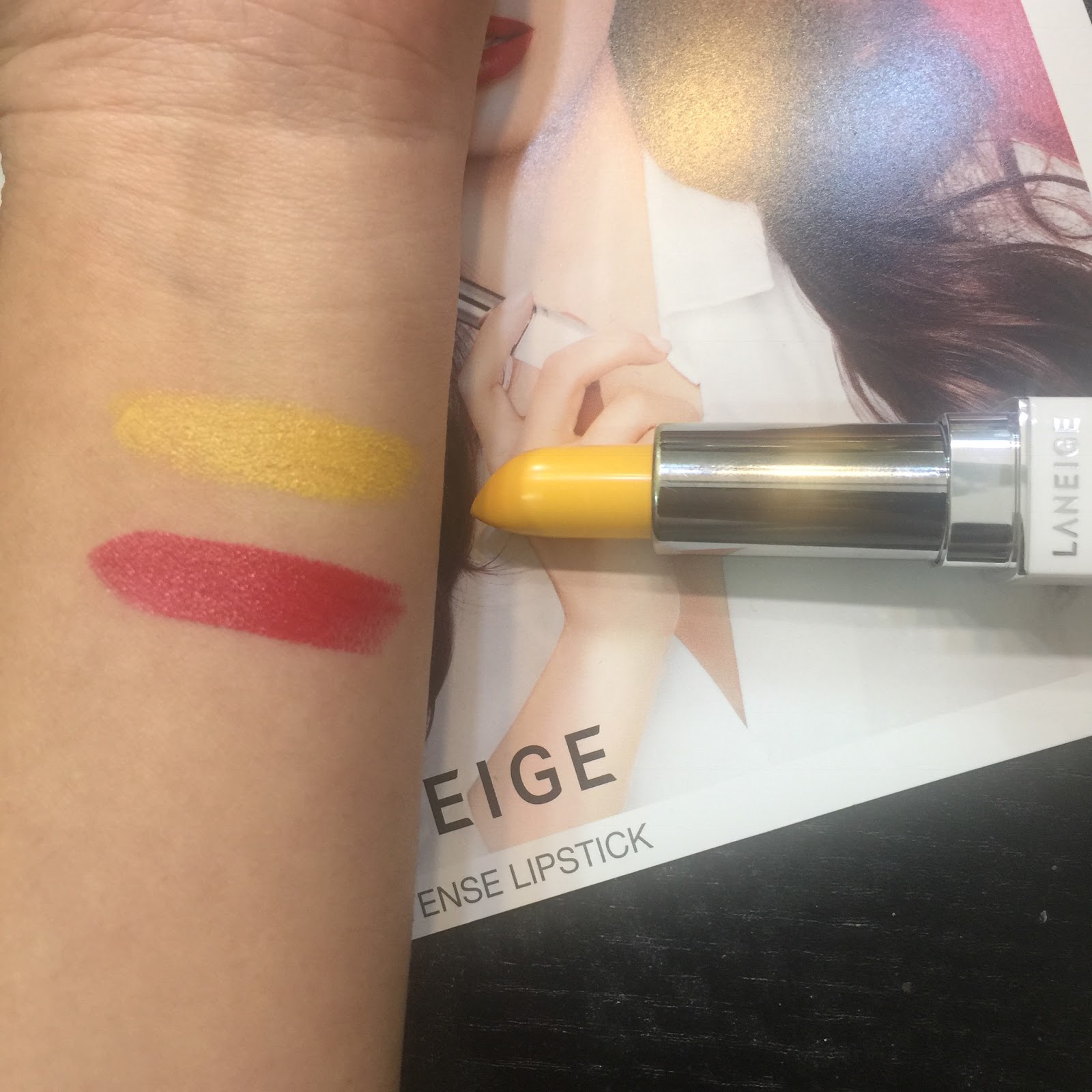 因為我的紅色只是塗了一層,不算是非常的實色,所以當塗上黃色唇膏就變了一個很自然的蜜桃橘色。所以Laneige的這支吾膏是非常的好玩。