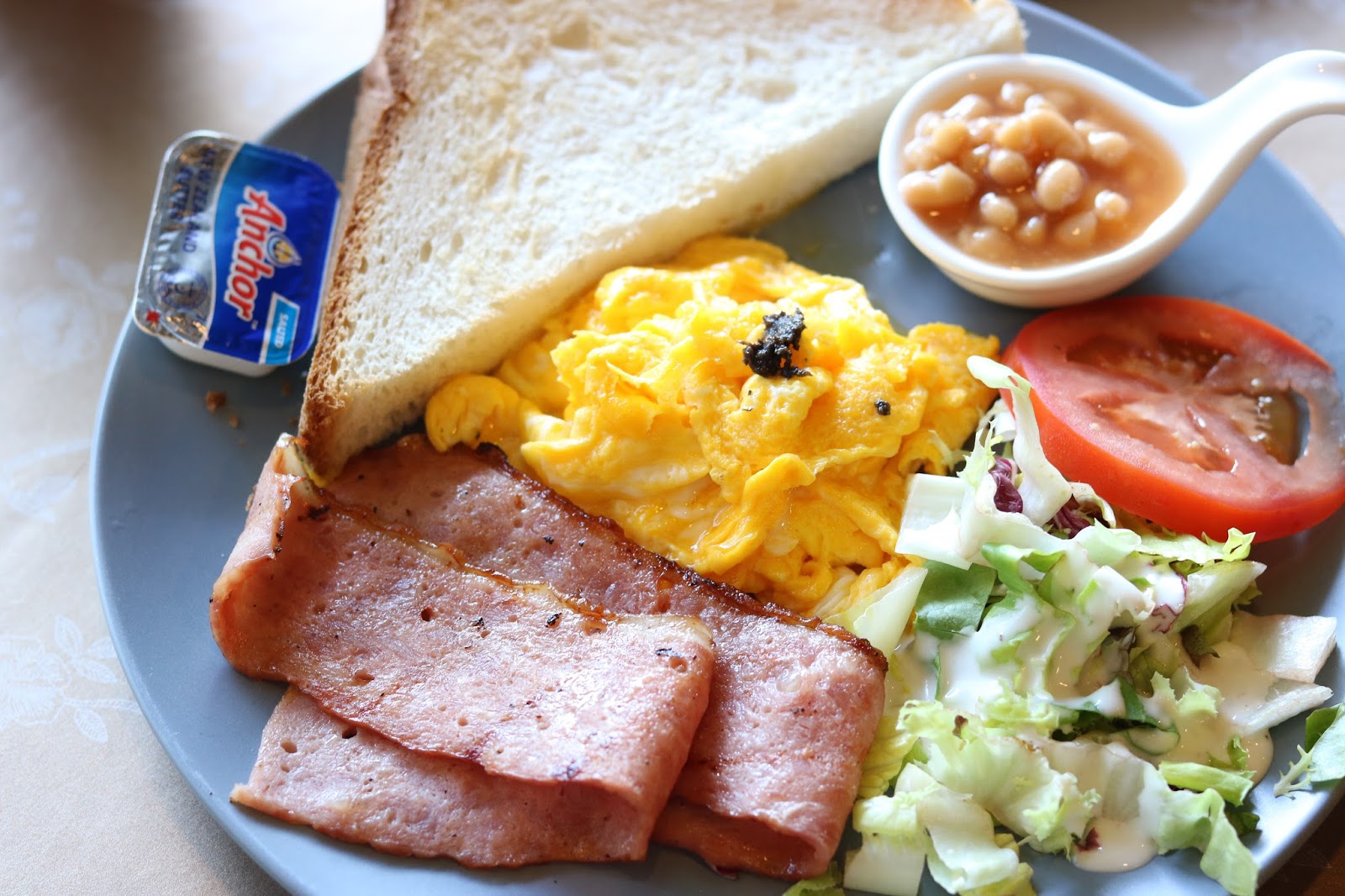全日早餐有番茄、煙肉、黑松露炒蛋、牛油多士及茄汁豆