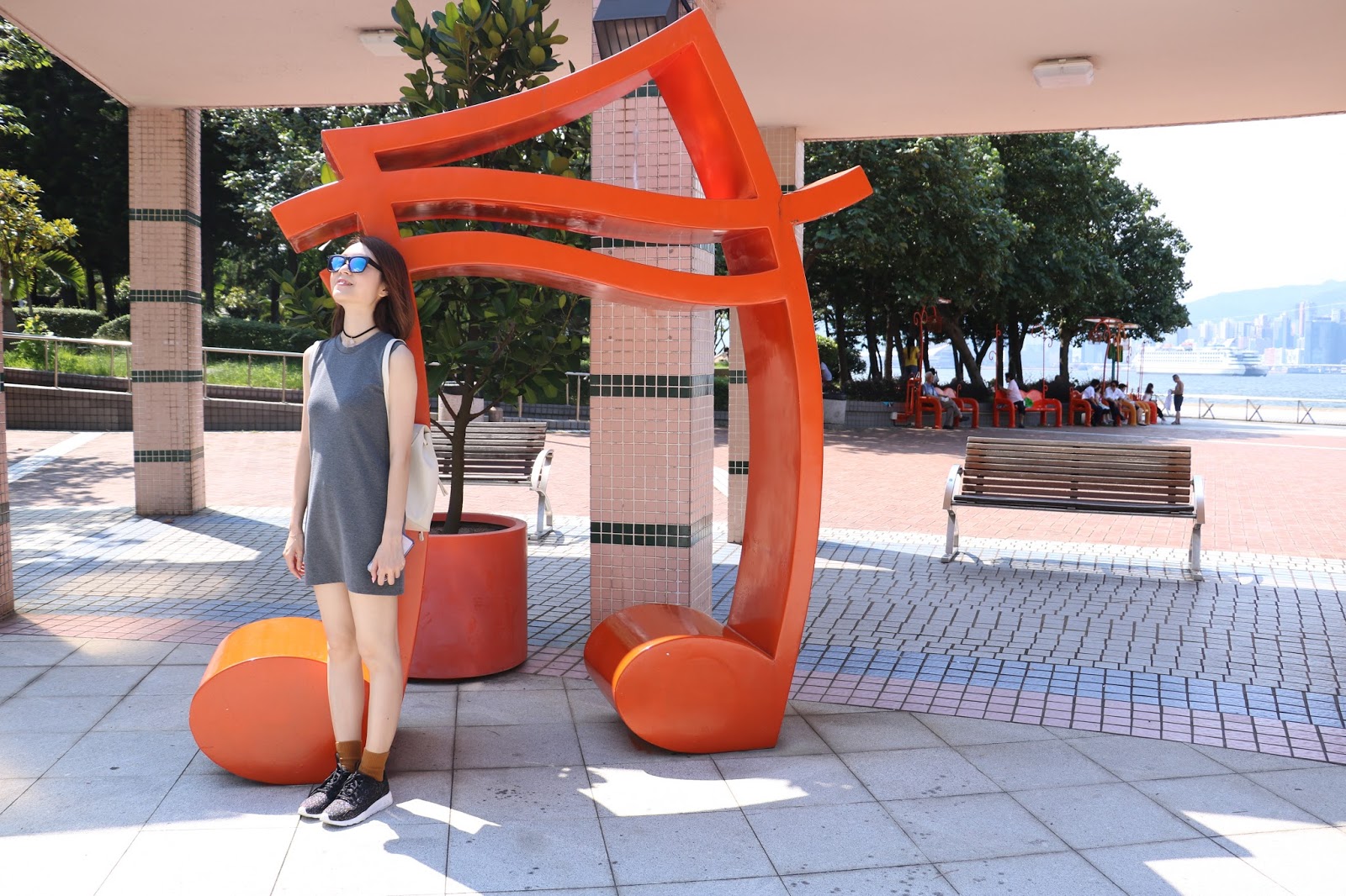 站在音樂符號旁拍照畫面十分有趣