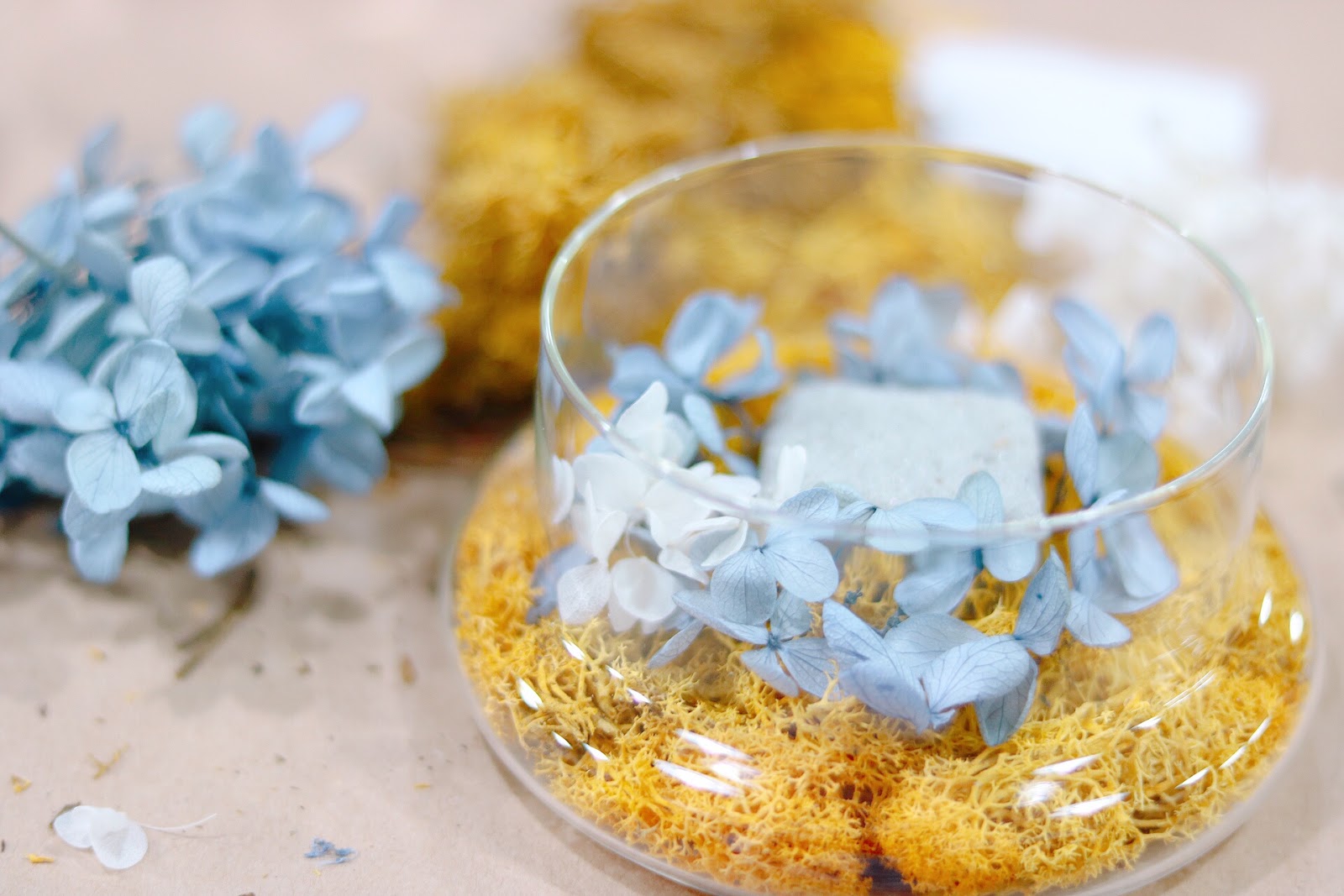 然後用鉗子輕力將繡球花插於草坪上,插上乾花等做裝飾