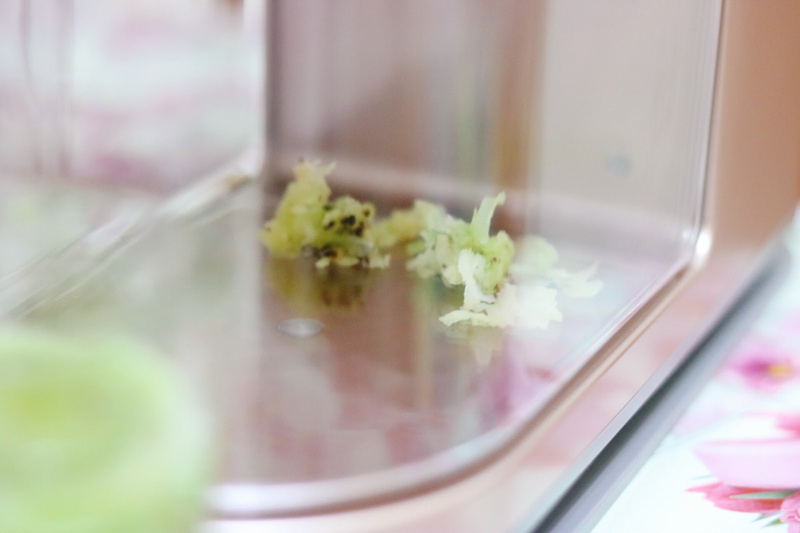 果汁就榨出來啦,而且還會把渣自動隔開呢 (好聰明呢~)