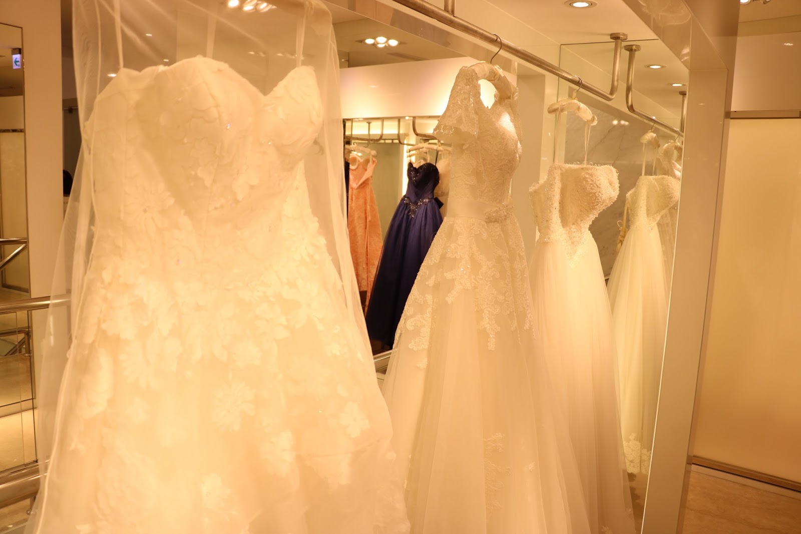她便把所選要求挑選出幾條婚紗及晚裝給我,