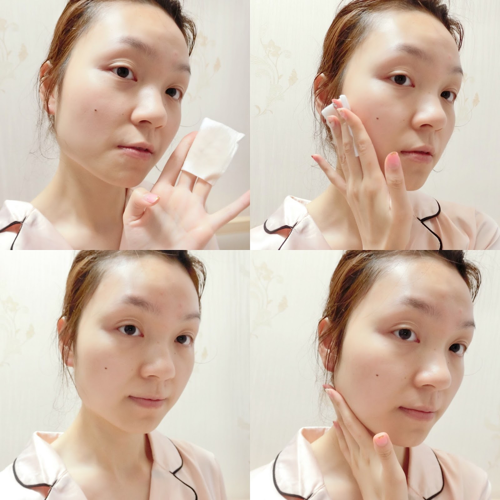 潔面後,將爽膚水倒在化妝棉上塗抹全面,可抹走殘留的污垢