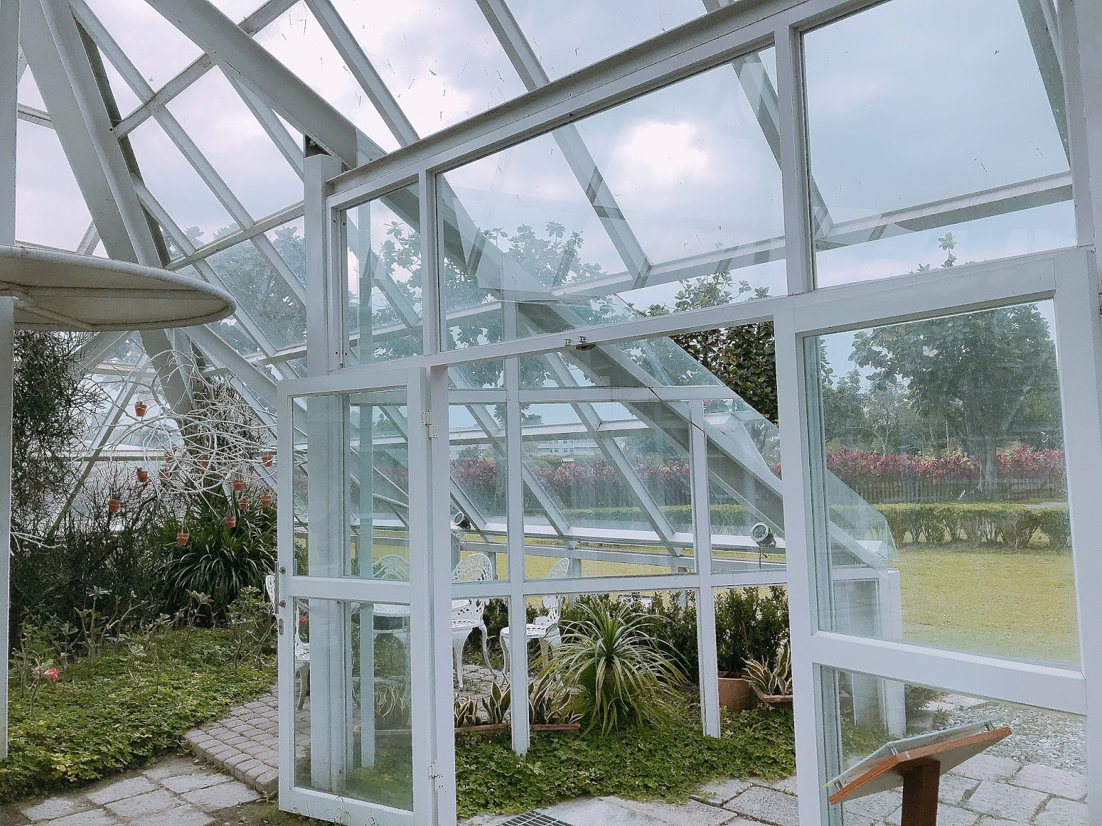 館內栽種了不同花卉植物,欣賞性極高。陽光穿透玻璃,