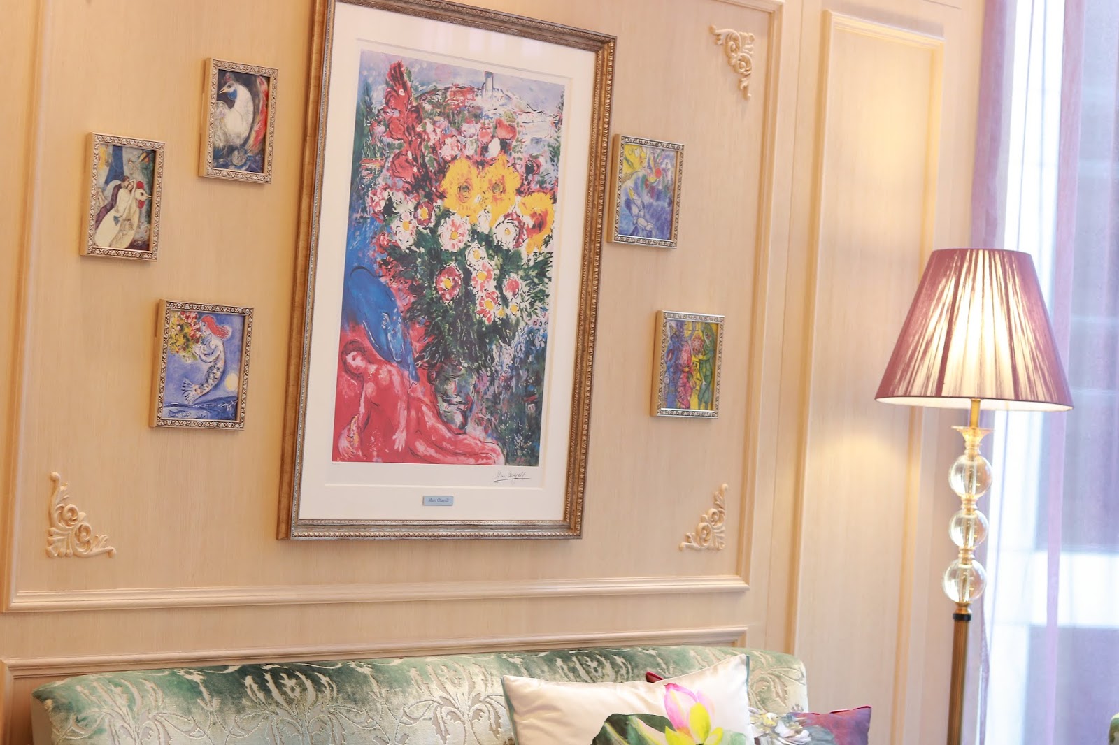 一出門口,見到玫瑰花牆、粉色絨櫈、花卉油畫,