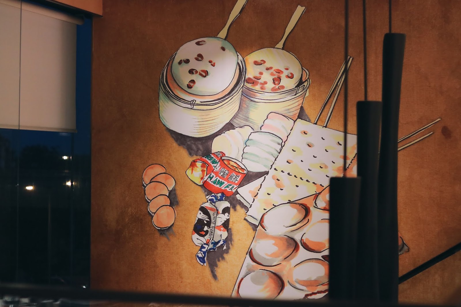 餐廳的佈置富有心思,暖水壺、大白兔糖、藤籃、小食車仔檔等,