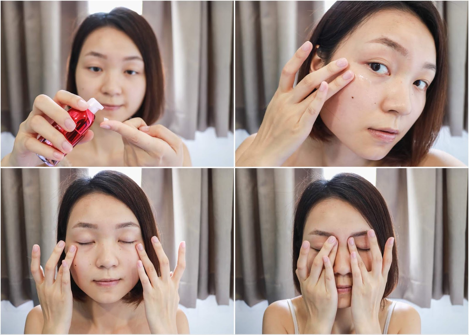 精華的質地屬於透明凝膠狀,質感輕柔,取一粒紅豆分量,平均點在眼周肌膚,用指腹輕輕推開,柔滑而不油膩,馬上被皮膚吸收,而且淡淡花香讓人感覺很舒服。